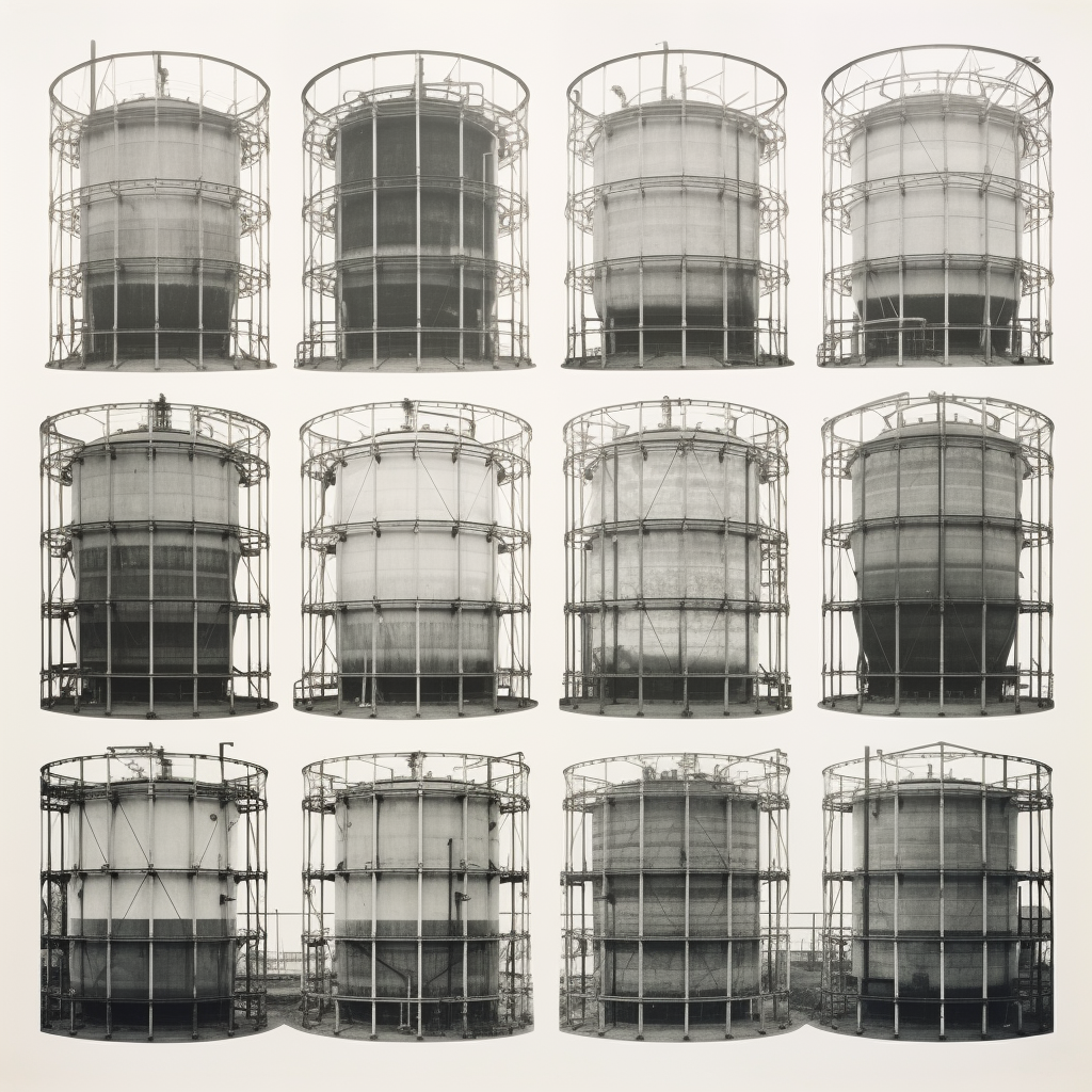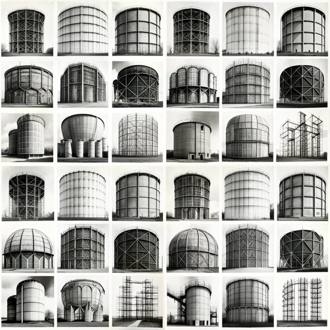 Something else about AI image creation also resembles Bechers’ Typologies. With tools like Midjourney you can create endless variations of anything it produces for you. Each time you create a new variation you are presented with four different types of the same object, but here the differences are random and meaningless. Much like with the Bechers approach, we are reduced to appreciating them as aesthetic forms. There is no function or content.