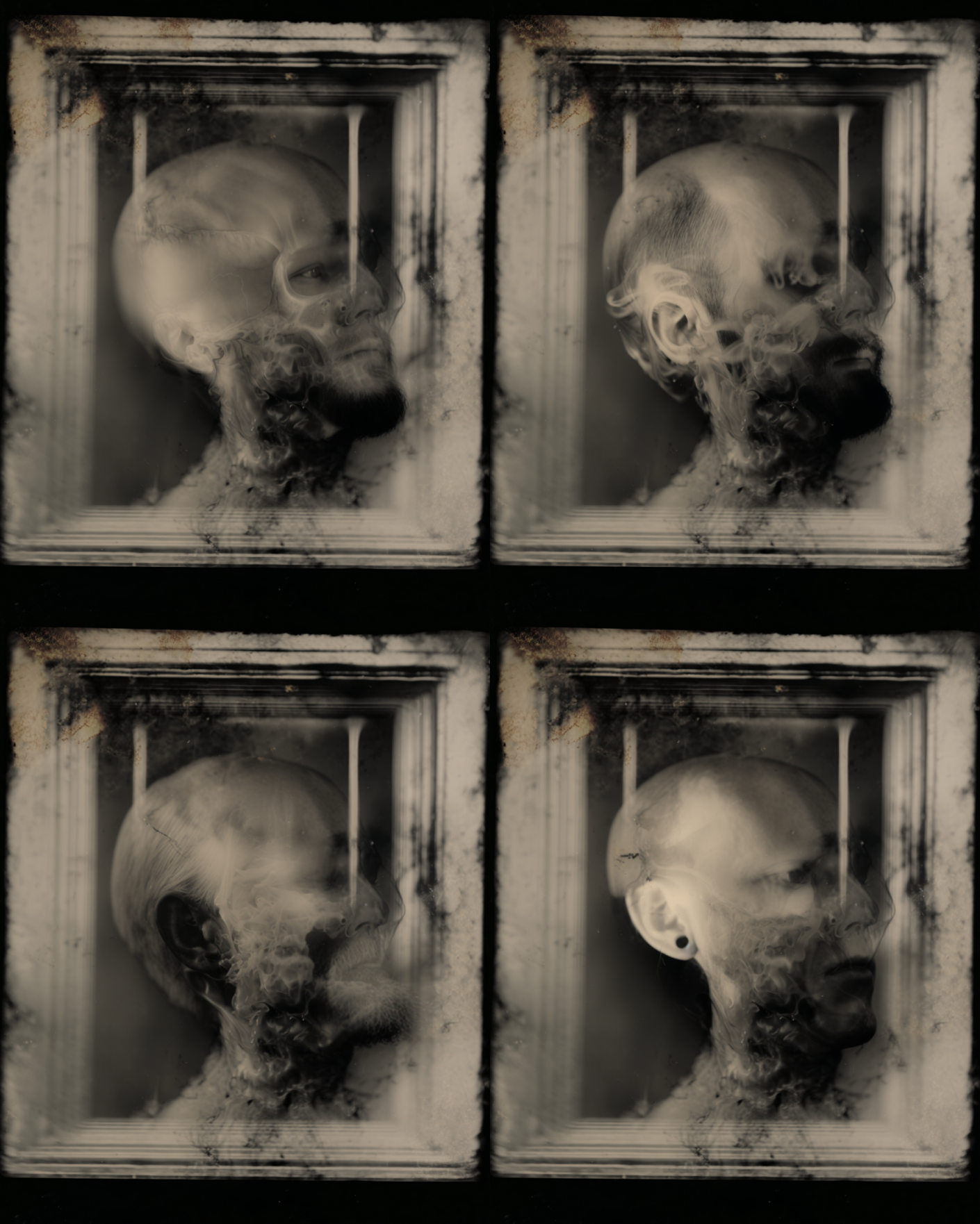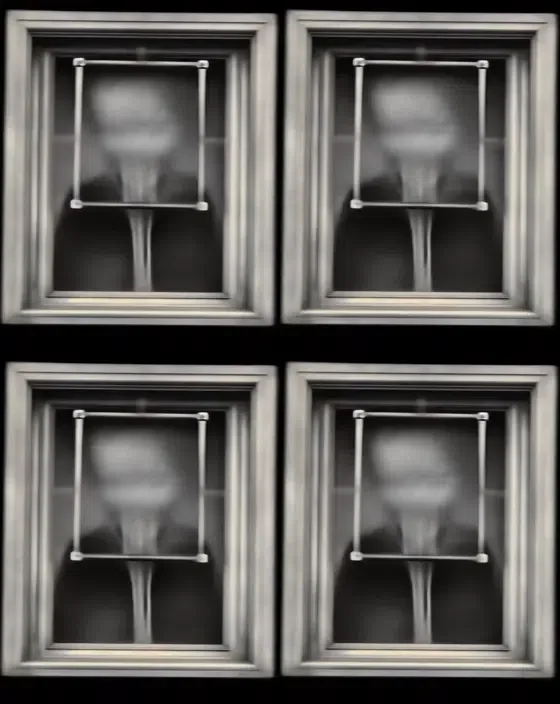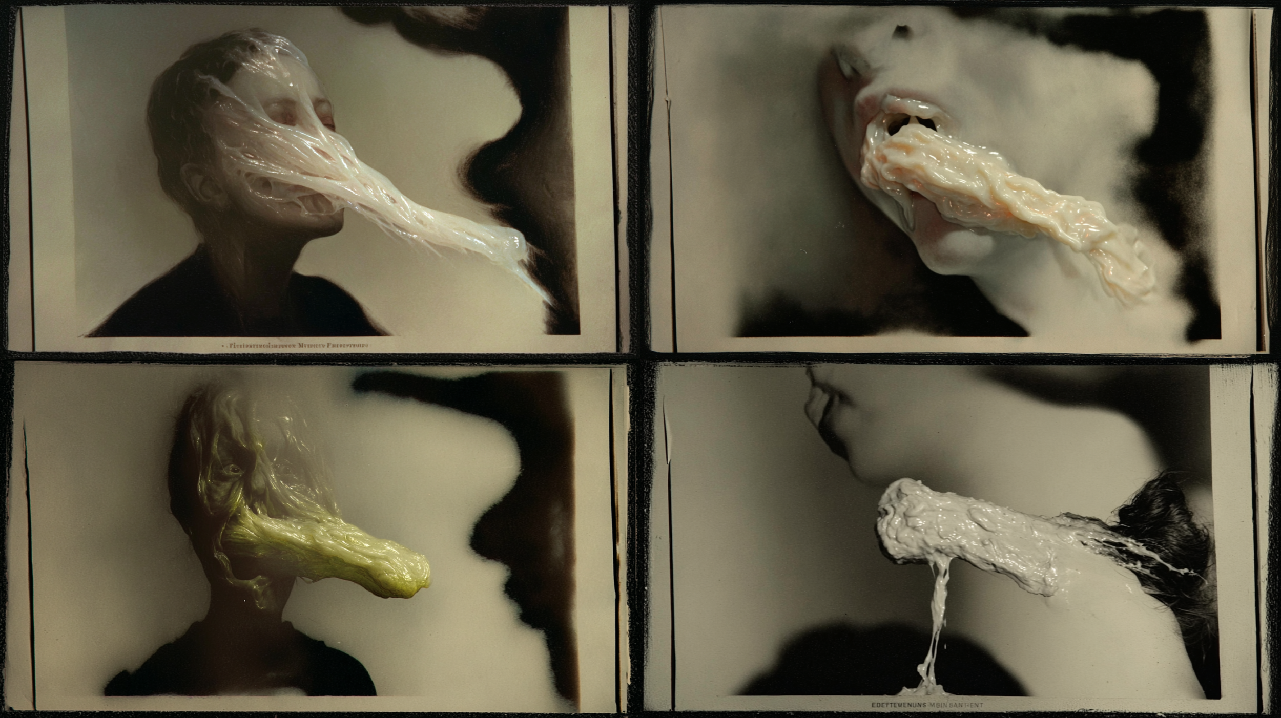 In attempting to recreate ectoplasm and spirit photography, using these models, the project floats this weird spectral substance to the surface. Previous investigations with AI, such as /imagine Ronsack and The Jettison began to show it seeping through the cracks. In these new works we can clearly see how one trace liquidizes and metamorphosizes into another, as each apparition becomes the seed for the next, creating a series of terrifying digital mutations.