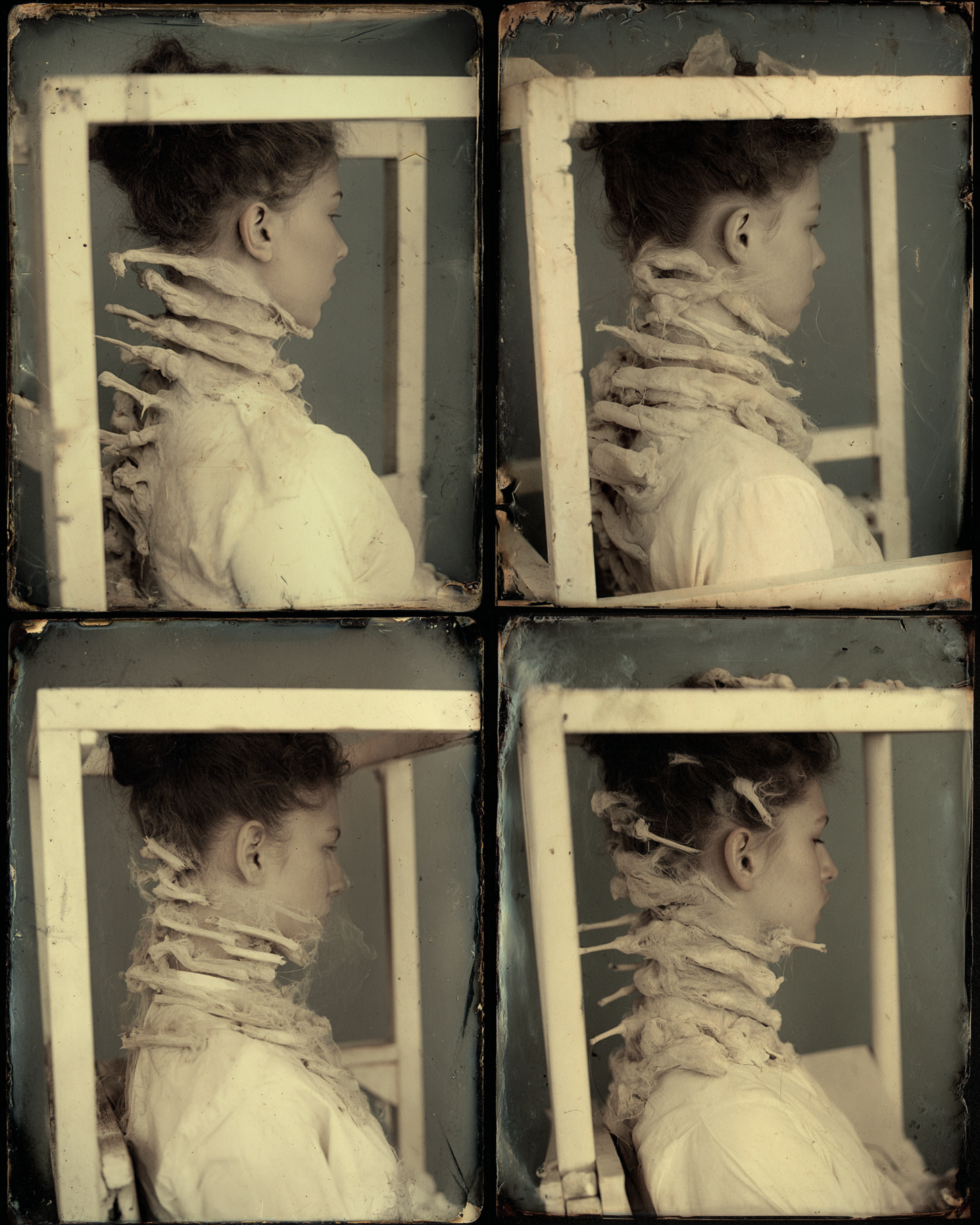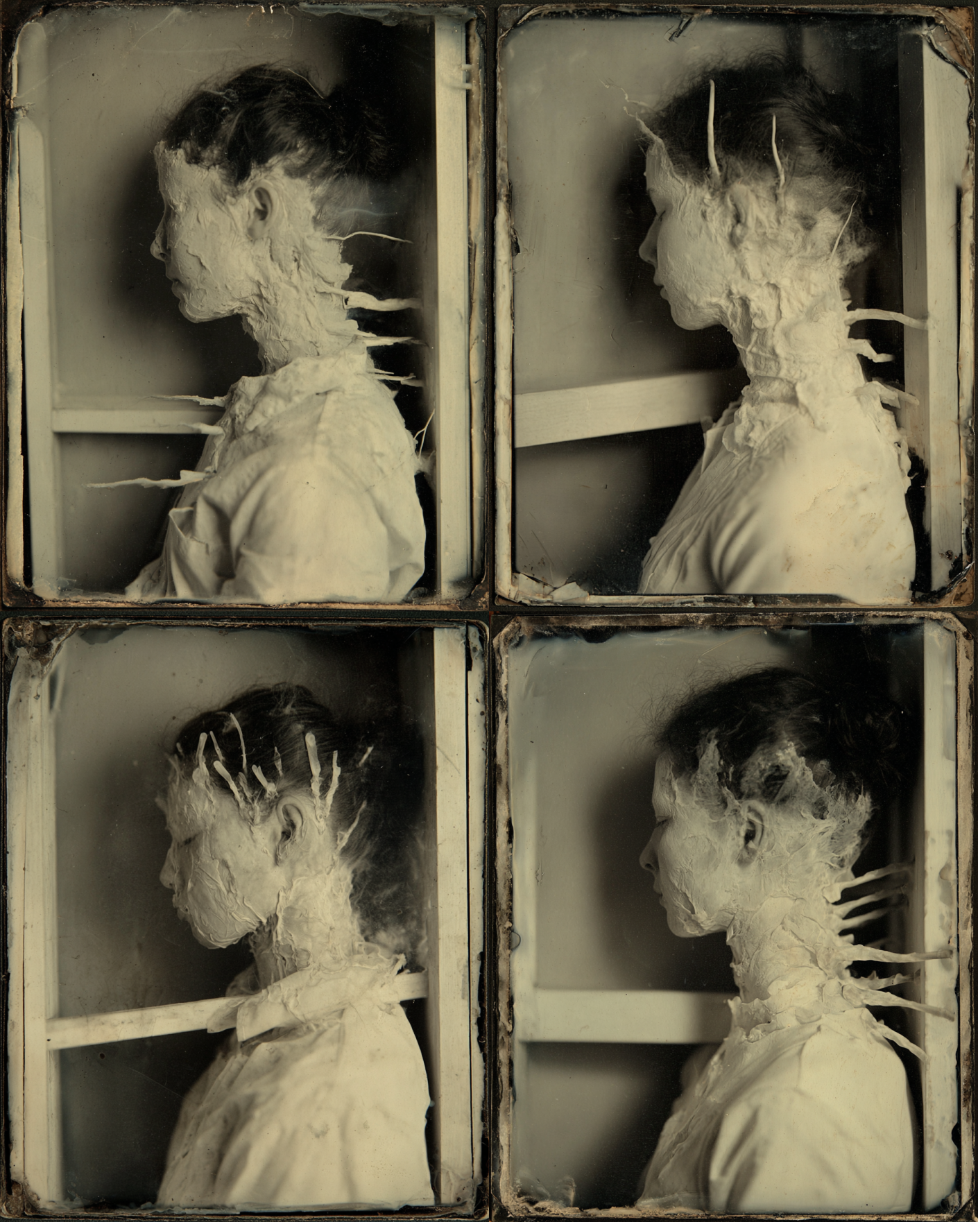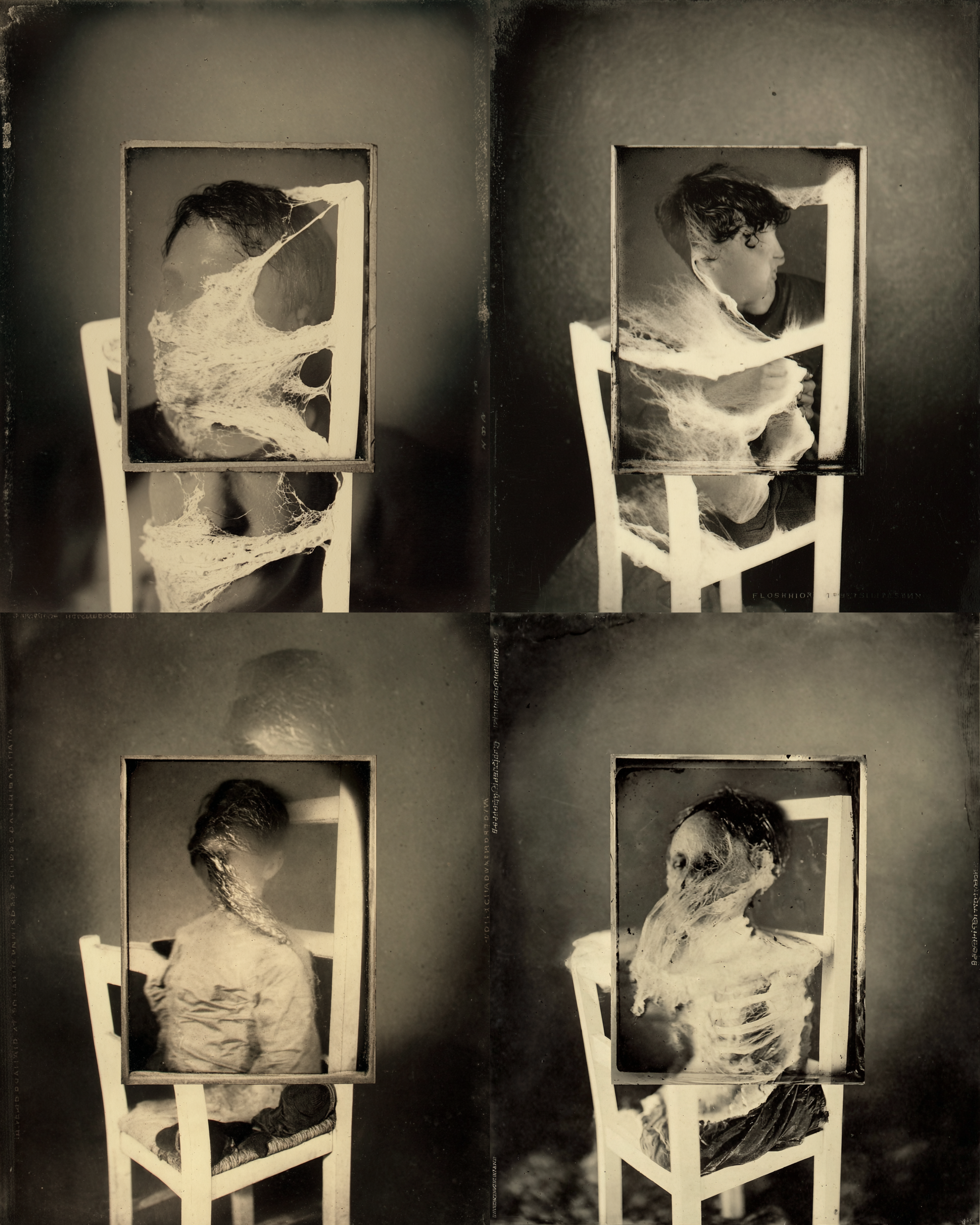 In attempting to recreate ectoplasm and spirit photography, using these models, the project floats this weird spectral substance to the surface. Previous investigations with AI, such as /imagine Ronsack and The Jettison began to show it seeping through the cracks. In these new works we can clearly see how one trace liquidizes and metamorphosizes into another, as each apparition becomes the seed for the next, creating a series of terrifying digital mutations.